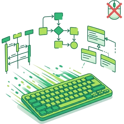 No mouse, no palette, no alignment fiddling. Type A -> B: request and you have a sequence diagram. Modify 10 arrows in seconds, not minutes.